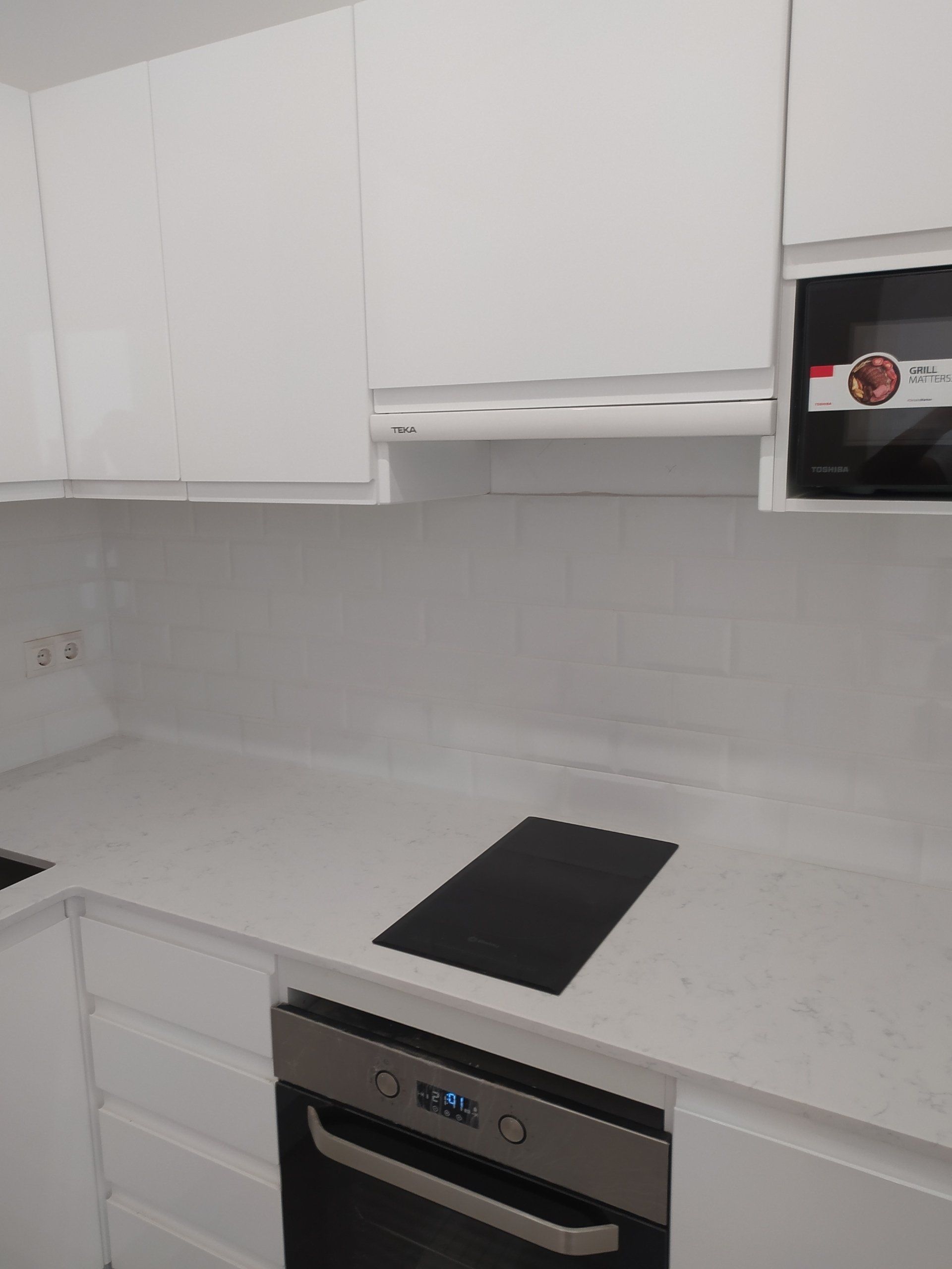 Y el revestimiento de la cocina es lo primero que vemos, en este caso hemos realizalo la instalación de unas cocinas con puertas lacadas.
